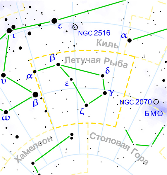 В Южном полушарии на ночном небе можно наблюдать интересный дуэт – созвездие Летучая Рыба и Золотую Рыбу, которая охотится на нее.