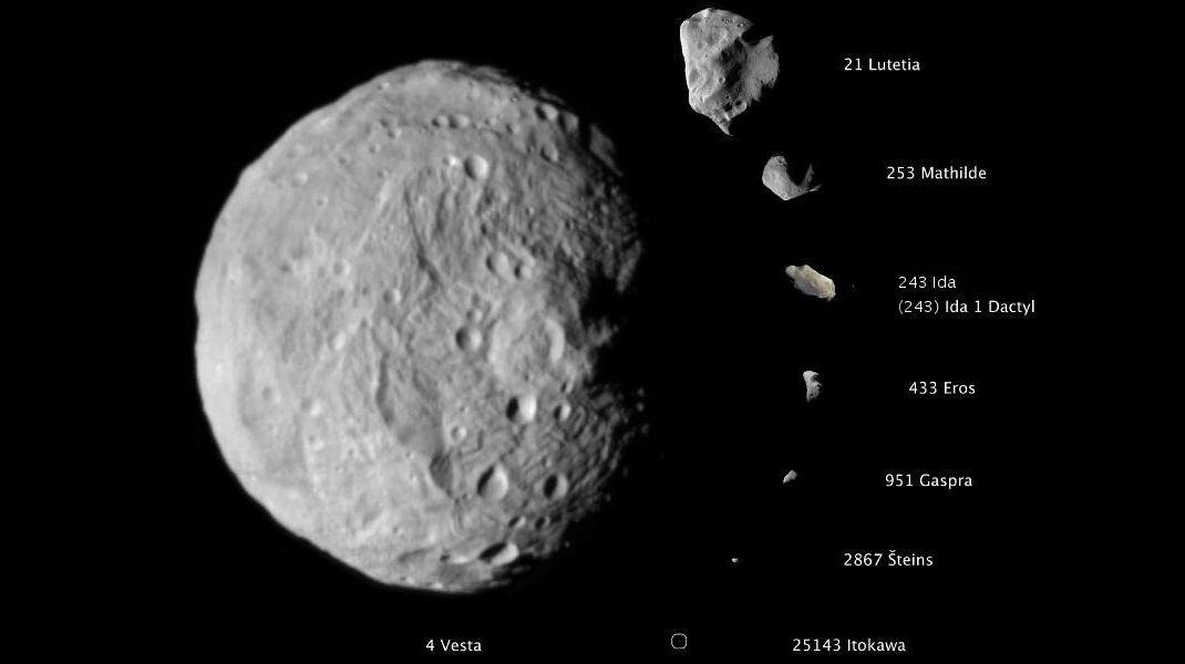 Составное изображение (в масштабе) астероидов, снятых в высоком разрешении. На 2011 год это были, от большего к меньшему: (4) Веста, (21) Лютеция, (253) Матильда, (243) Ида и его спутник Дактиль, (433) Эрос, (951) Гаспра, (2867) Штейнс, (25143) Итокава.